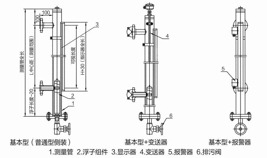 由連通器、主導(dǎo)管、磁性浮子、現(xiàn)場指示牌,及捆綁式液位變送器或液位開關(guān)組成。