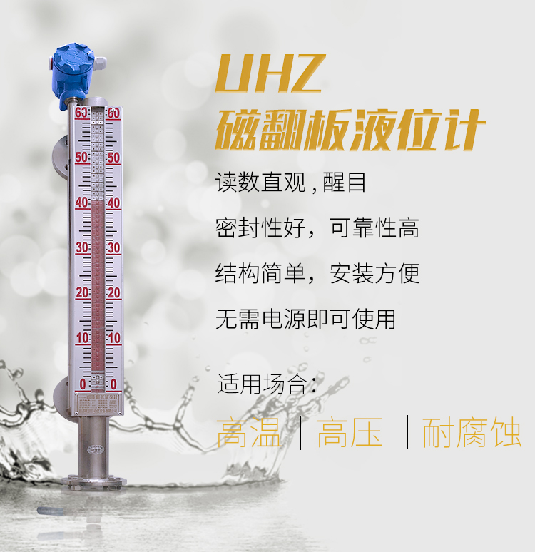 UHZ磁翻板液位計是具有可靠的安全性的檢測儀表,由于具有磁性藕合的隔離密閉結(jié)構(gòu)。尤其適用于易燃、易爆和腐蝕有毒液體的液位檢測。從而使原復(fù)雜環(huán)境的液位檢測手段變得簡單和可靠和可靠安全。